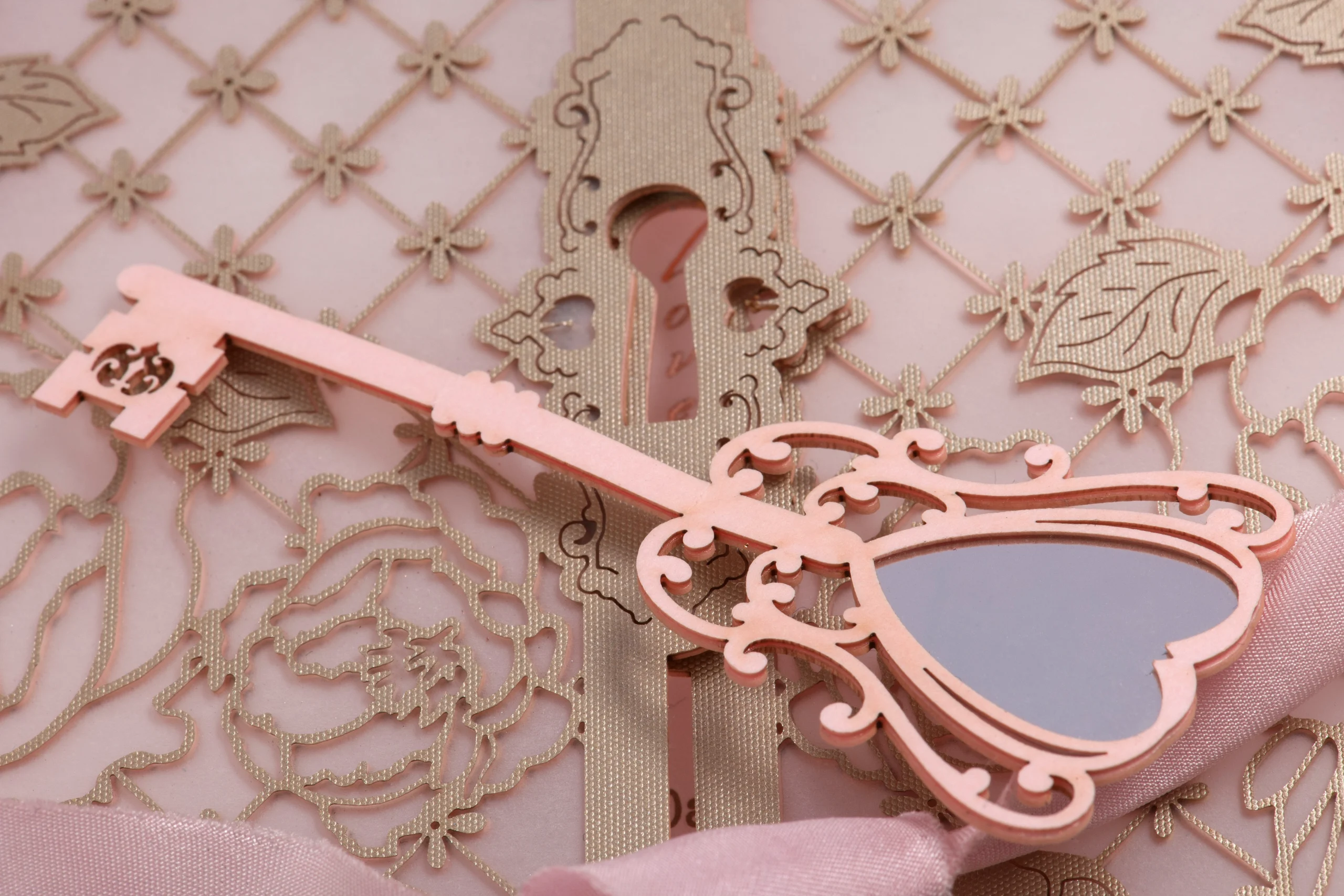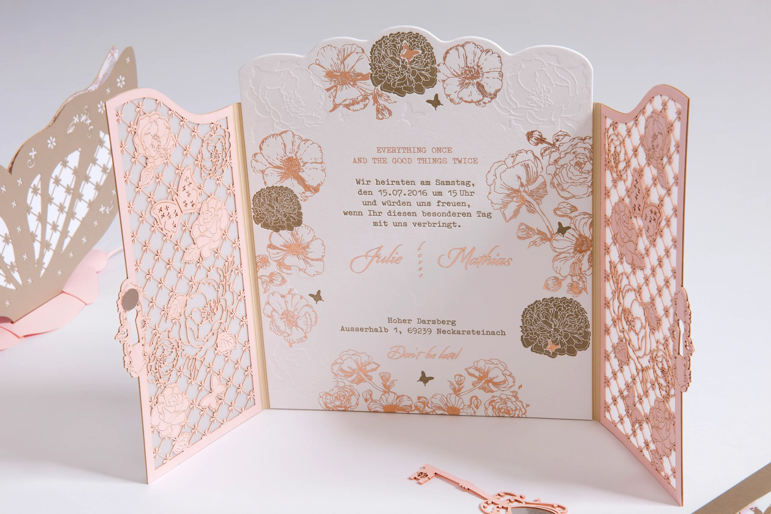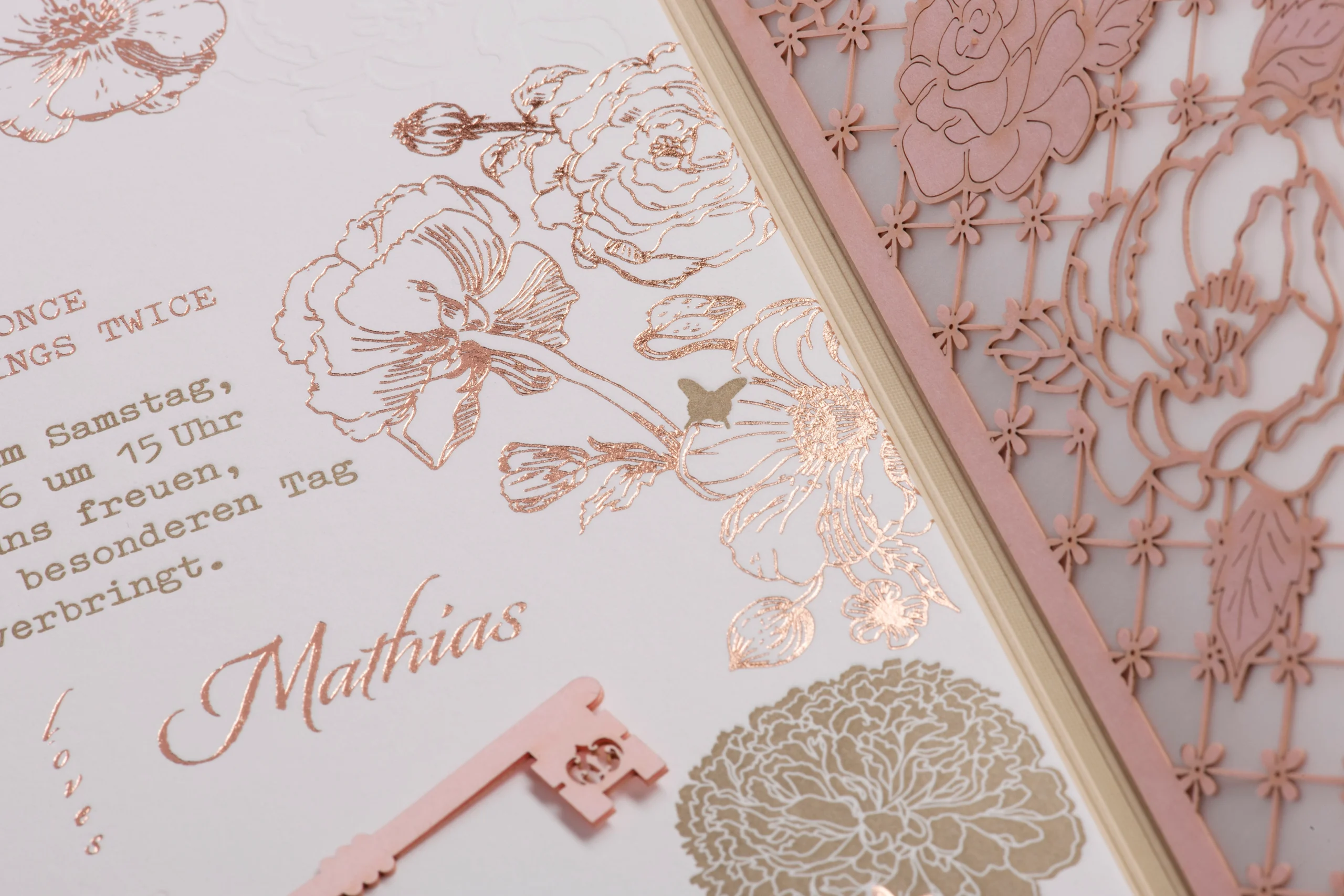 Diese Papeterie ist wie ein Garten voller Geheimnisse. Tore, Roségold und Blindprägung laden ein, das Verborgene zu entdecken. Ein Schlüssel liegt bereit und mit ihm beginnt die Reise.