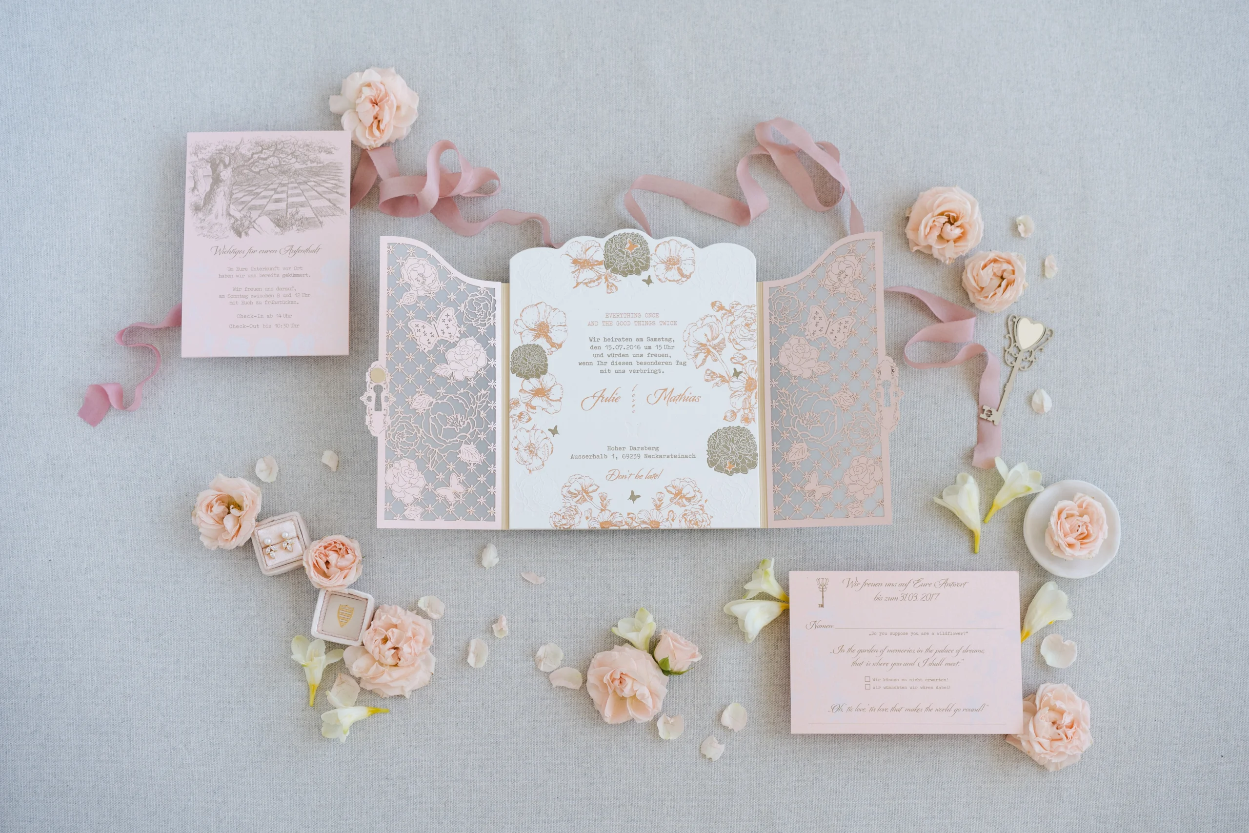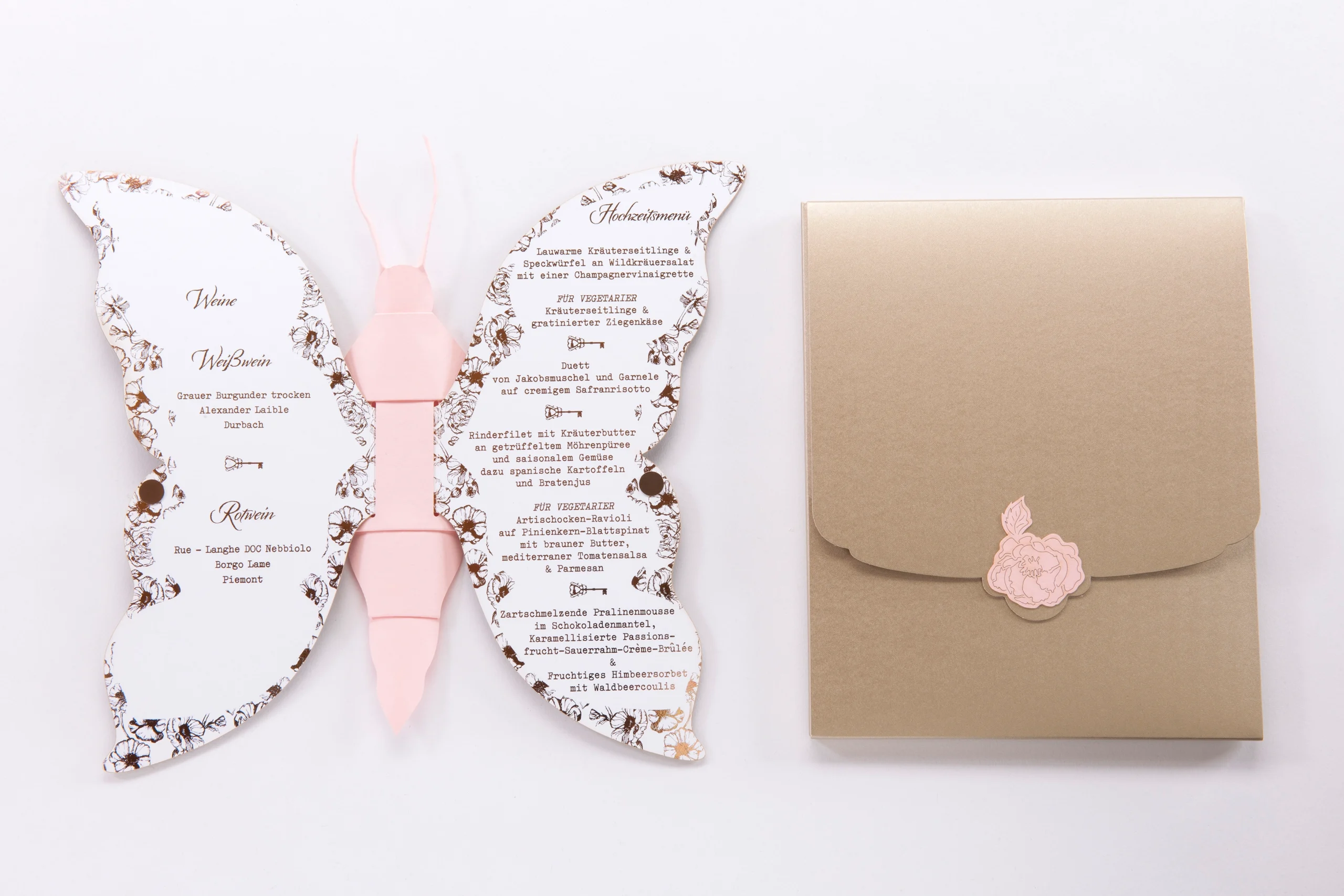 Ein Design-Unikat voller versteckter Details und absolut einzigartig. Brautpaare, die auf der Suche nach exklusiver Hochzeitspapeterie sind, sind bei Sonja an der richtigen Adresse.