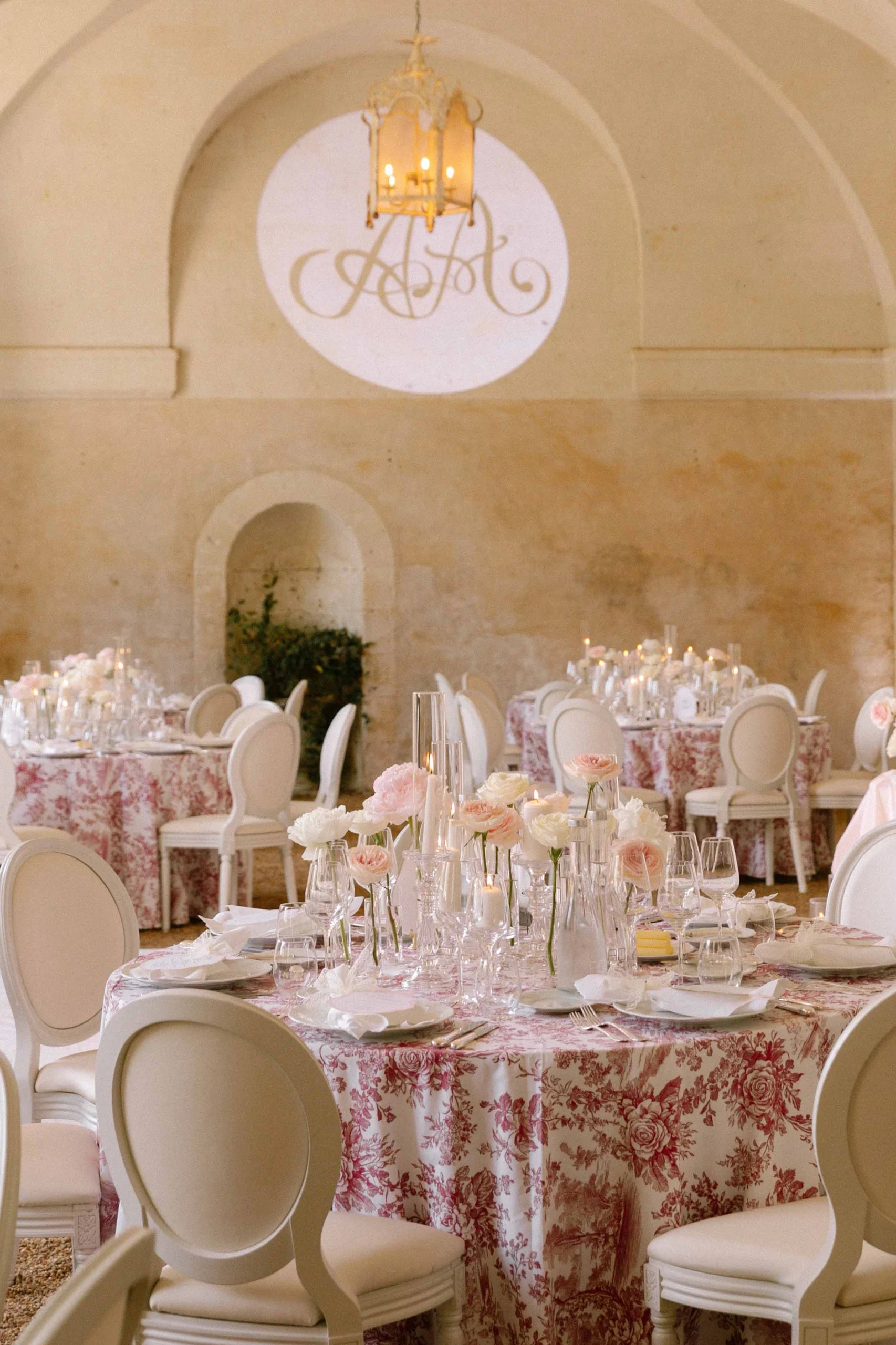 Die Haptik spielte eine zentrale Rolle. Dafür entwickelte ich ein eigens angefertigtes Toile de Jouy Muster, in dem sich Elemente des Schlosses, üppige Pfingstrosen und die Hunde des Paares wiederfinden.