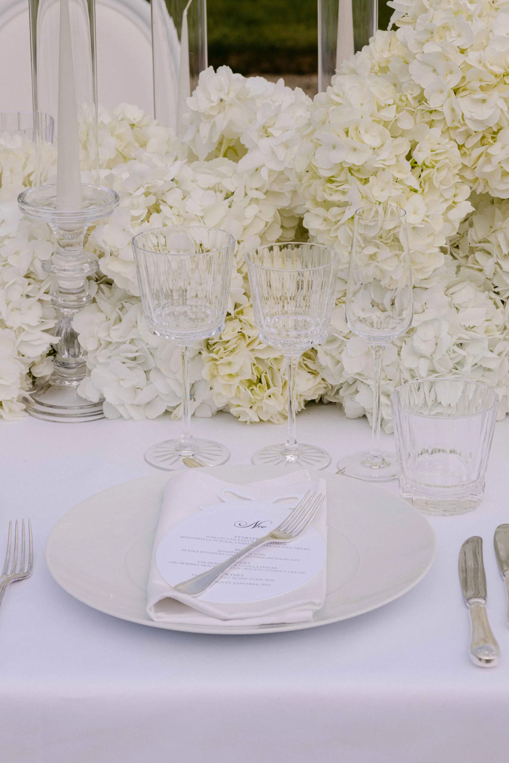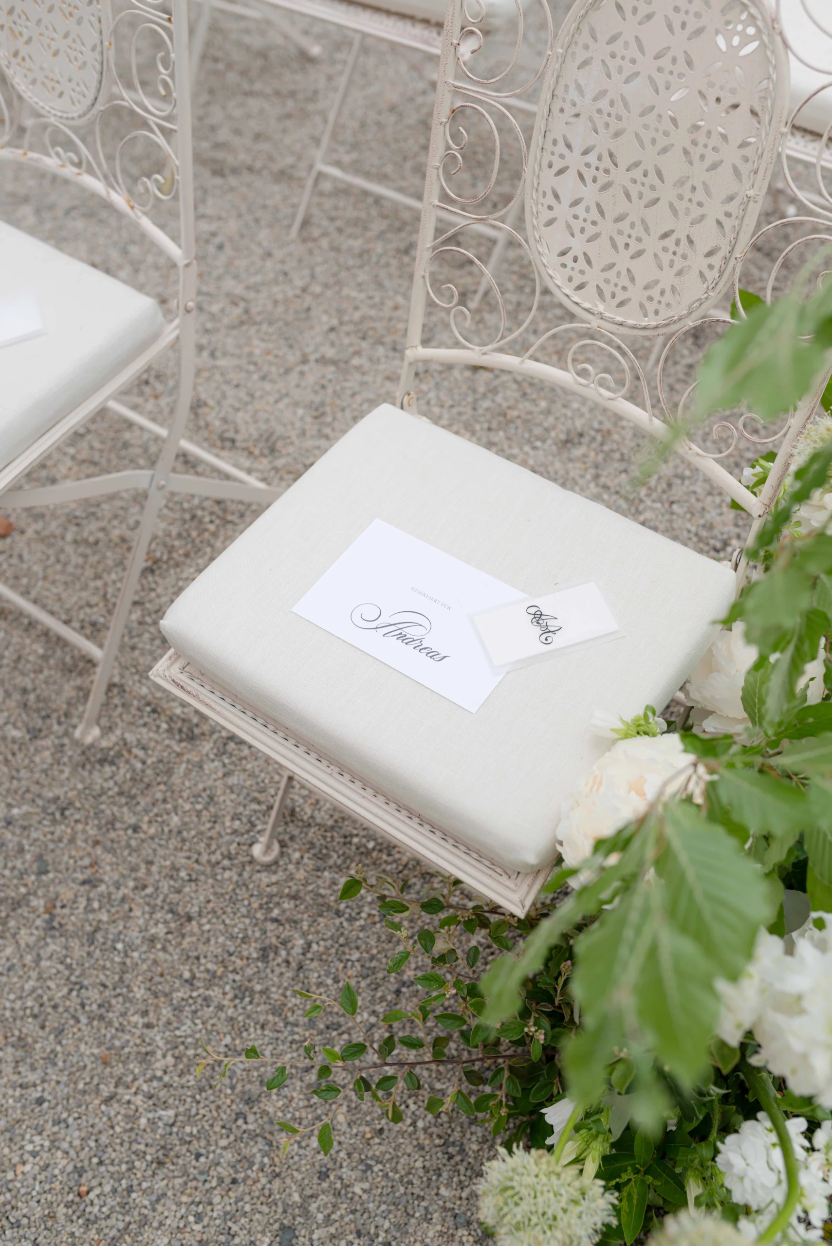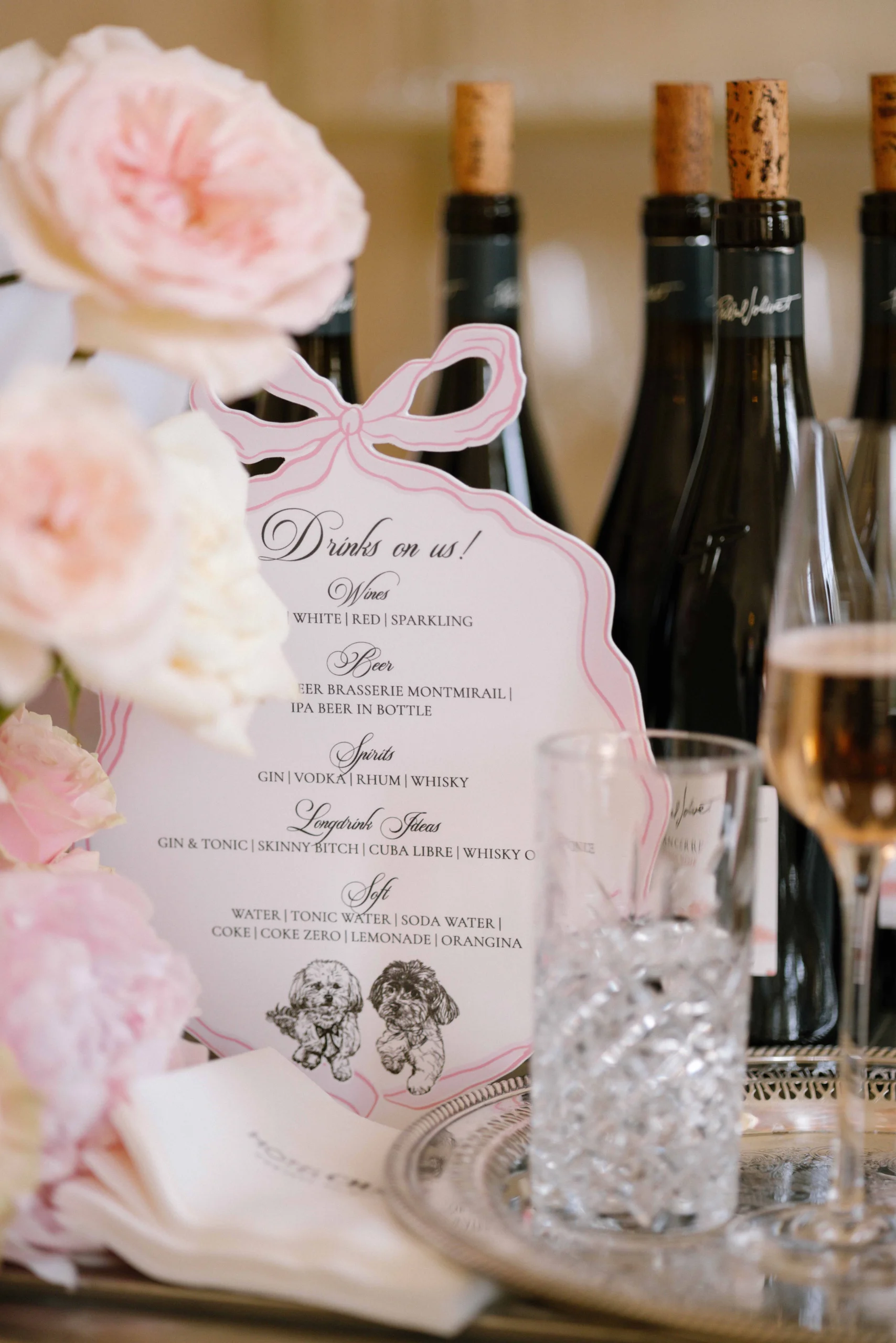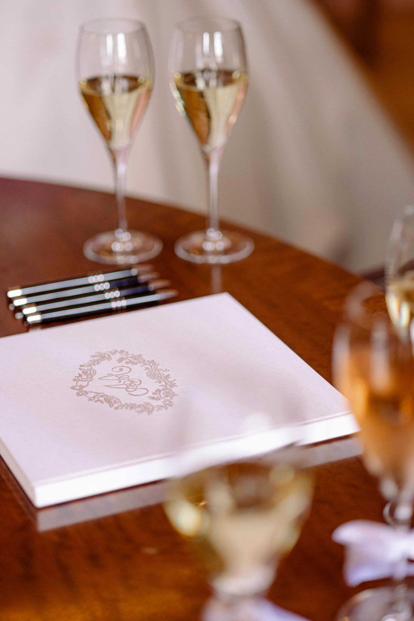 Zur Kollektion gehörten ein Save the Date in Schleifenform mit Couture-Kuvert, Einladungen mit Monogramm-Siegel, Menükarten für Vorabend und Hochzeitstag, Barkarten, Tischkarten, Welcome Booklets und ein Gästebuch aus Leinen.